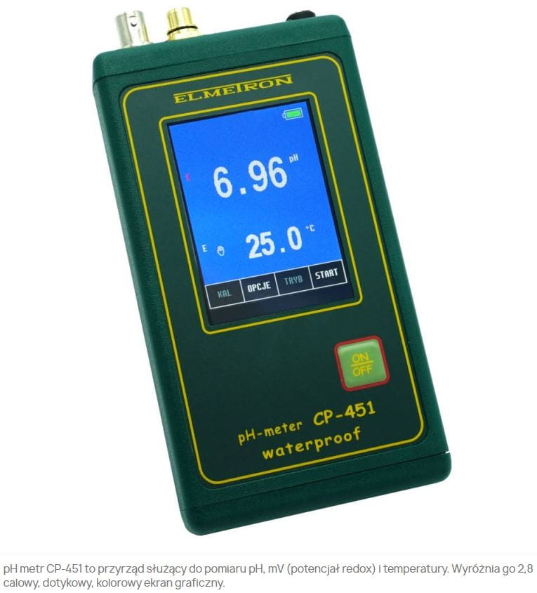 pH-metr CP-451 należy do nowej generacji przyrządów pomiarowych. Wyróżnia go 2,8 calowy, dotykowy, kolorowy ekran graficzny.